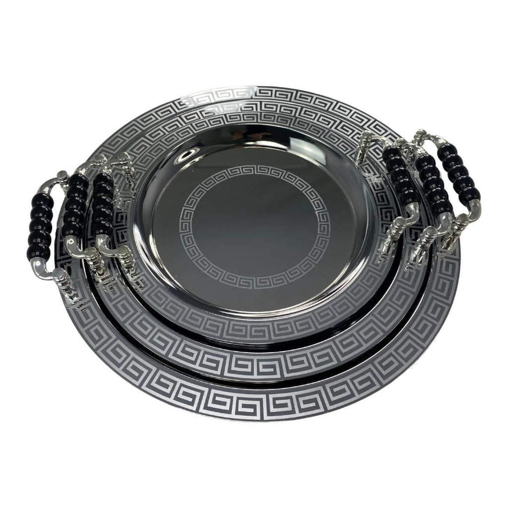 Lot de 3 plateaux de service rond en acier inoxydable de couleur argenté avec des poignées. C'est un produit idéal pour servir des pâtisseries avec accompagnement thé ou café.