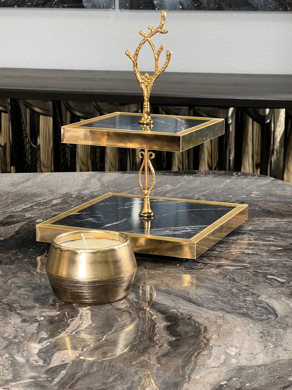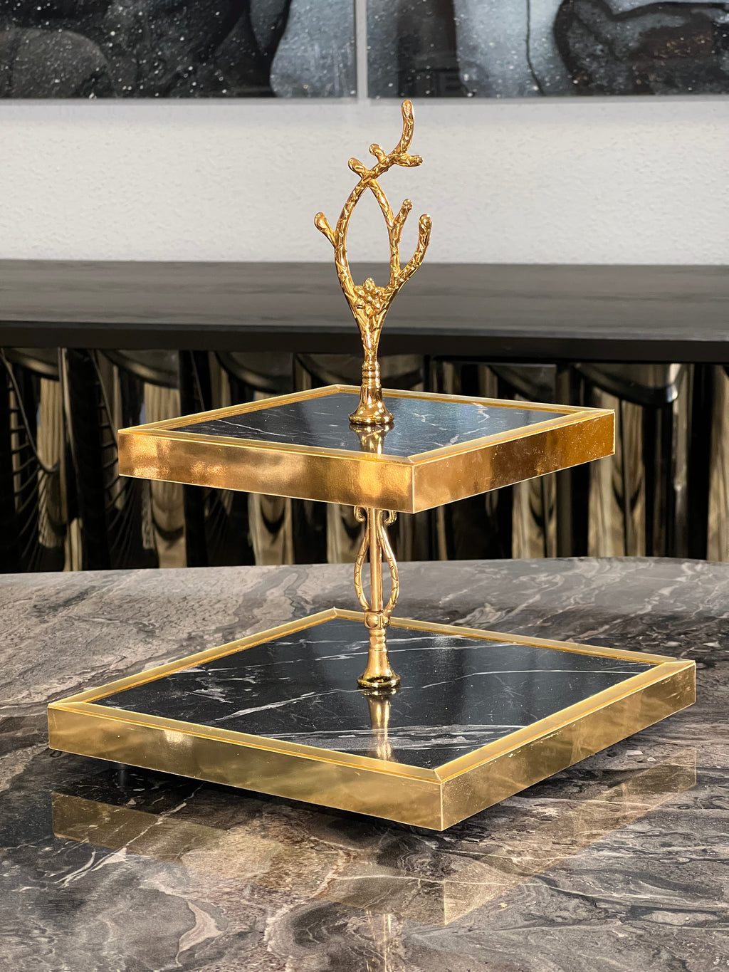 ZEYVE Présentoir à gâteau 2 étages motif marbré noir doré